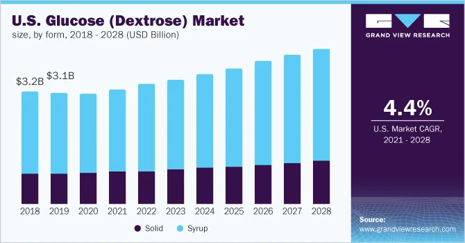 The global glucose market size is anticipated to reach USD 63.6 billion by 2028, expanding at a CAGR of 5.0% from 2020 to 2028, according to a report by Grand View Research, Inc. The market's growth is being driven by increasing demand for sugar-based products and a rising preference for natural ingredients in cosmetics and personal care applications.