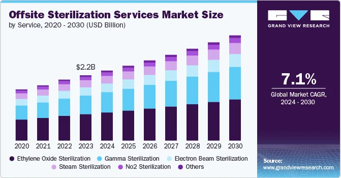 The global offsite sterilization services market size is anticipated to reach USD 3.47 billion by 2030 and is projected to grow at a CAGR of 7.05% from 2024 to 2030, according to a new report by Grand View Research, Inc. This market includes a wide range of services and technologies aimed at sterilizing medical devices, pharmaceuticals, and food products outside the primary manufacturing or healthcare settings. These services play a vital role in eliminating viable microorganisms to ensure product safety and compliance with health standards.
