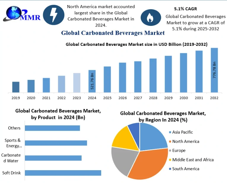 The Carbonated Beverages Industry size was valued at USD 521.76 Billion in 2024 and the total Carbonated Beverages revenue is expected to grow at a CAGR of 5.1% from 2025 to 2032, reaching nearly USD 776.78 Billion.