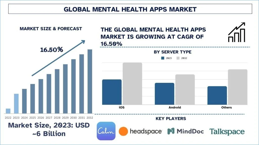 According to the Univdatos Analysis, The Mental Health Apps Market was valued at approximately USD 6 Billion in 2023 and is expected to grow at a substantial CAGR of around 16.5% during the forecast period (2024-2032) owing to the increased internet penetration and widespread adoption of smartphones.