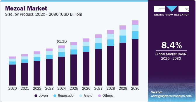 The global mezcal market size was valued at USD 1,140 million in 2024 and is anticipated to reach USD 1,852.5 million by 2030, expanding at a CAGR of 8.4% from 2025 to 2030. This growth is significantly influenced by the rising consumer inclination toward premium alcoholic beverages.