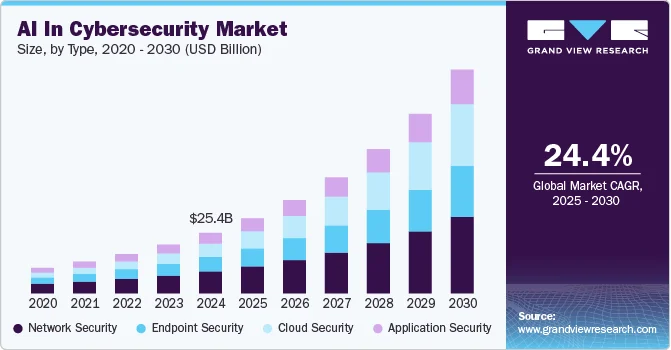 The global AI in cybersecurity market was valued at USD 25.35 billion in 2024 and is anticipated to reach USD 93.75 billion by 2030, reflecting a compound annual growth rate (CAGR) of 24.4% from 2025 to 2030. The adoption of AI technologies, such as natural language processing and machine learning, is on the rise to bolster cybersecurity measures.