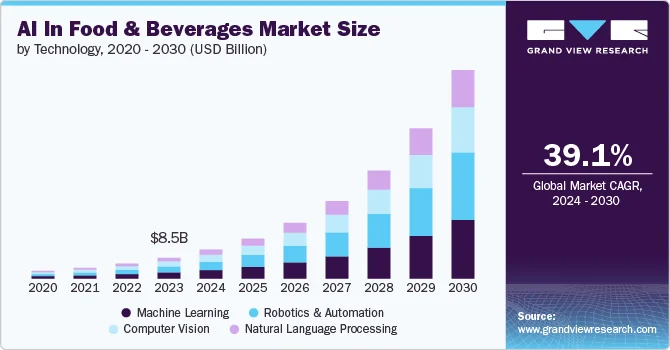 The global AI in food & beverages market was valued at USD 8.45 billion in 2023 and is projected to reach USD 84.75 billion by 2030, with a compound annual growth rate (CAGR) of 39.1% from 2024 to 2030. AI is transforming the food and beverages industry by improving efficiency and automation in processing, sorting, and packaging, which helps reduce errors and meet global food demands.