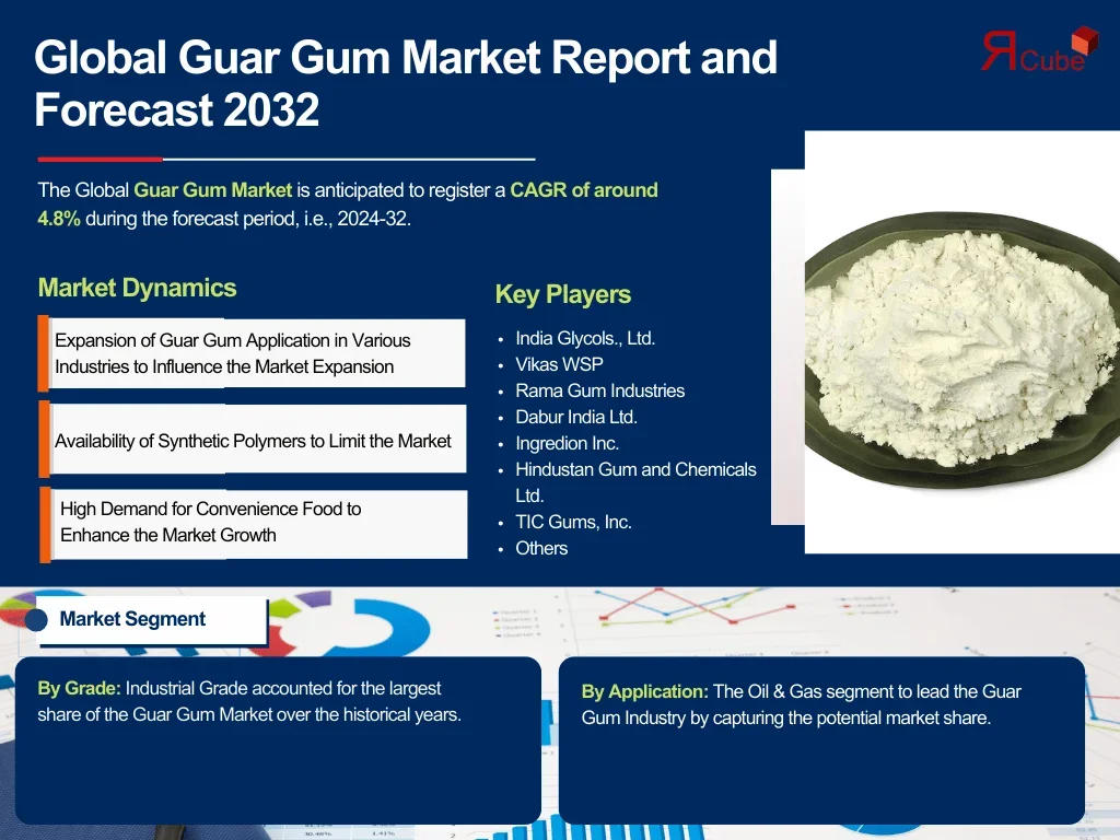 According to the latest report by The Report Cube, The Guar Gum Market was valued at USD 1.21 Billion in 2024 and is further anticipated to register a CAGR of around 4.8% during the forecast period, i.e., 2024-32.
