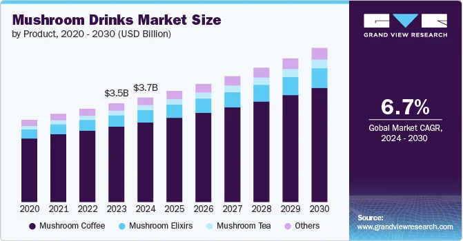 The global mushroom drinks market size was estimated at USD 3.70 billion in 2023 and is projected to reach USD 5.78 billion by 2030, growing at a CAGR of 6.7% from 2024 to 2030. Mushroom drinks are rapidly gaining traction in the functional beverages sector, where consumers are increasingly pursuing health benefits beyond basic nutrition.