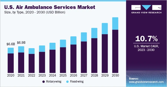 The global air ambulance services market was valued at USD 14.6 billion in 2022 and is expected to grow to USD 32.9 billion by 2030, registering a compound annual growth rate (CAGR) of 10.7% between 2023 and 2030. According to the World Health Organization (WHO), chronic diseases are the primary cause of death globally, accounting for more than 60% of total fatalities.