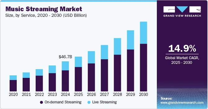 The global music streaming market size was estimated at USD 46.66 billion in 2024 and is projected to reach USD 108.39 billion by 2030, growing at a CAGR of 14.9% from 2025 to 2030. This growth is primarily fueled by the rising consumption of digital music across various devices.