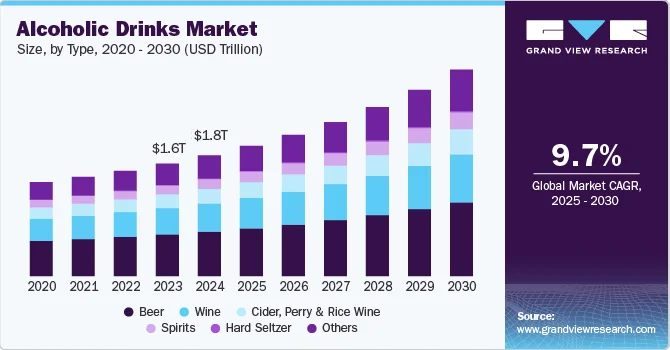 The global alcoholic drinks market was valued at USD 1,762.12 billion in 2024 and is projected to reach USD 3,015.22 billion by 2030, registering a CAGR of 9.7% from 2025 to 2030. This robust growth is largely driven by rising consumption of premium beer in established markets such as the U.S. and the UK. Demand for beer, wine, and dark spirits continues to climb, contributing significantly to overall market revenue. The expanding popularity of pubs, bars, and restaurants further supports market growth, as more consumers seek out social and dining experiences where alcoholic beverages are a key component. Additionally, there is growing acceptance of uniquely flavored beers, which are gaining attention for their potential digestive benefits, adding to their appeal.