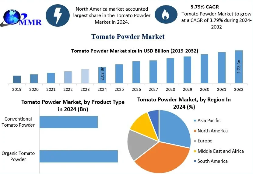 The Tomato Powder Industry was valued at USD 2.02 billion in 2024 and is anticipated to reach approximately USD 2.72 billion by 2032, expanding at a CAGR of 3.79% during the forecast period. Tomato powder is produced through dehydration and milling of ripe tomatoes, resulting in a versatile, shelf-stable product used across multiple food and beverage applications. It’s valued for its long shelf life, intense flavor, ease of transportation, and consistent quality, making it a practical alternative to fresh or canned tomatoes.