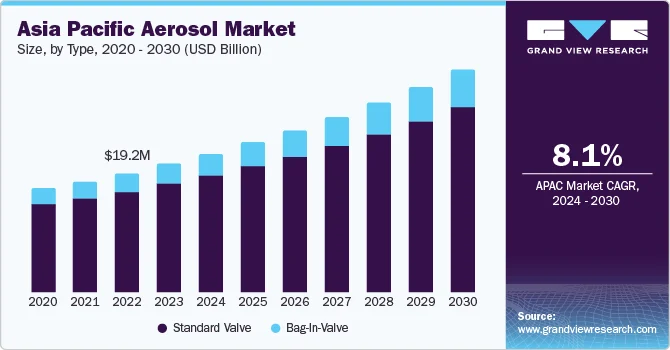 The Asia Pacific aerosol market was valued at USD 20.8 billion in 2023 and is projected to reach USD 36.0 billion by 2030, expanding at a CAGR of 8.1% from 2024 to 2030. This growth is primarily fueled by a rising young middle-class population in emerging economies such as India and China, where increased disposable income and digital engagement are driving higher demand for personal care products like deodorants, hair mousse, and shaving foams.