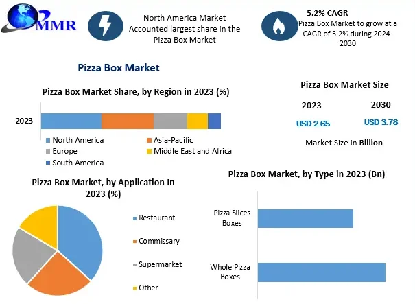 Pizza Box Industry size was valued at USD 2.65 Bn. in 2023 and the total Pizza Box revenue is expected to grow at 5.2 % through 2024 to 2030, reaching nearly USD 3.78 Bn.