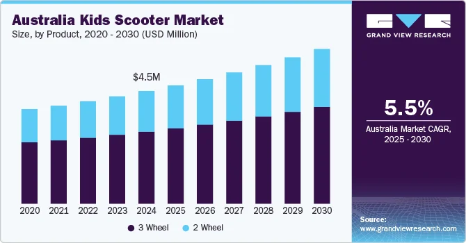 The Australia kids scooter market, valued at USD 4.49 million in 2024, is projected to expand at a Compound Annual Growth Rate (CAGR) of 5.5% from 2025 to 2030. This growth is primarily driven by increasing parental concern for child health, with experts advocating scooting for its benefits in metabolism, cardiopulmonary health, blood circulation, and overall immunity, aiding in the prevention of conditions like obesity.
