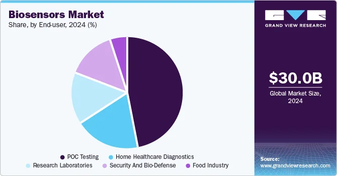 • The end-user segment includes research laboratories, the food industry, home healthcare diagnostics and security POC testing, and bio-defense. Biosensors in point-of-care testing led the market in 2024 accounting for a revenue share of 47.9%. Key factors driving the segment growth include technological advancements that create innovative products, such as ultra-sensitive printable biosensors for PoC applications that help detect or monitor organic fluids like urine, saliva, blood, and sweat.