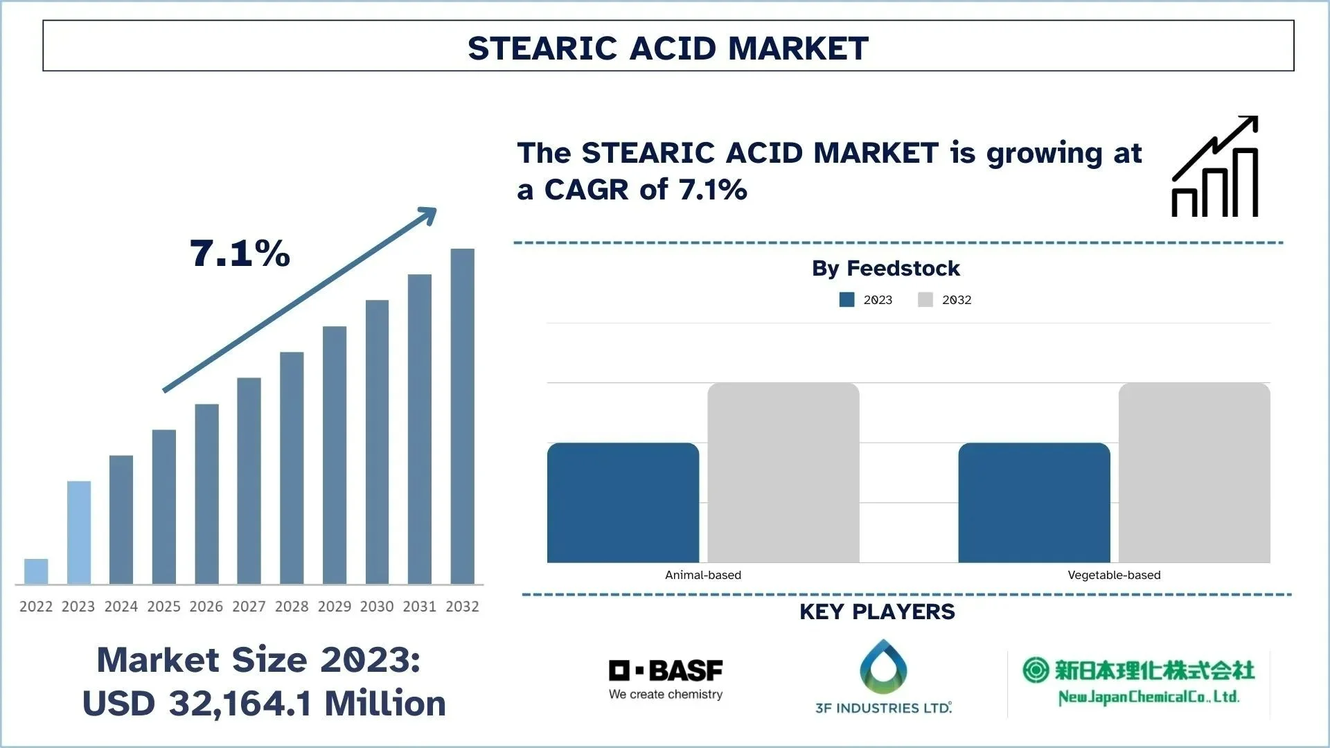 The chemical industry continues to grow its stearic acid business because this product serves numerous applications in cosmetics production and many related industrial sectors. The sector produces more stearic acid through plant oil processing as customers choose eco-friendly products instead of animal fat varieties. Stearic acid serves two important functions in skincare formulations by making emulsions and making them feel pleasant which leads to high-quality cosmetic products. Industrial operations benefit greatly from stearic acid in its roles as a mixing aid during surfactant and lubricant production and also as a dispersing agent and plasticizer during rubber manufacturing and plastic creation. The growing need for plant-based ingredients pushes market numbers higher because industrial businesses worldwide produce more products. Individuals who choose environmentally friendly cleaning products that contain natural ingredients support stearic acid consumption growth in the market. As stearic acid production and usage grow fast in the countries across APAC especially China India and Southeast Asia region the worldwide stearic acid market will expand. According to the UnivDatos, rising demand from cosmetics and personal care industries, and the increasing shift toward sustainable, plant-based alternatives would drive the global scenario of the Stearic Acid market. As per their “Stearic Acid Market” report, the global market was valued at USD 32,164.1 Million in 2023, growing at a CAGR of 7.1% during the forecast period from 2024 - 2032 to reach USD Million by 2032.