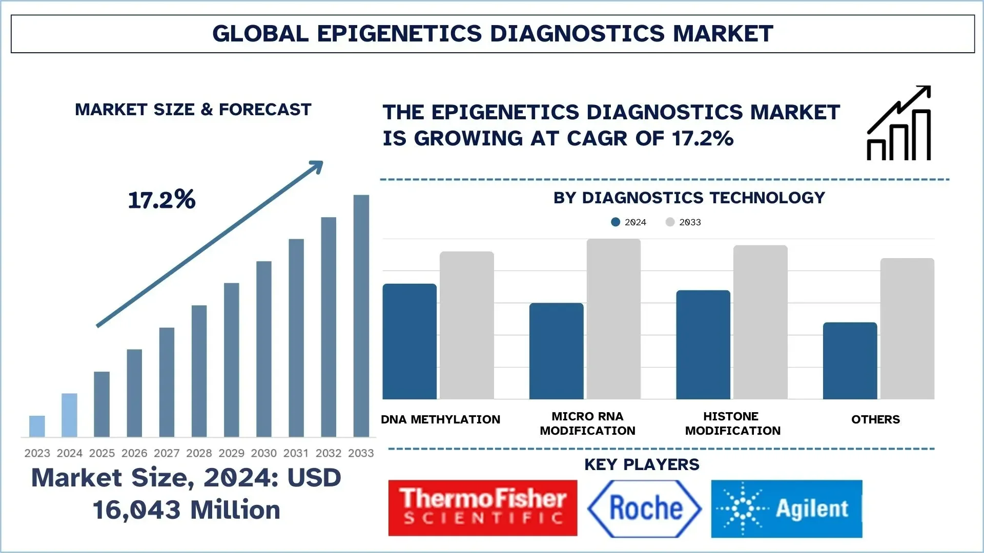 According to a new report by UnivDatos, the Epigenetics Diagnostics Market is expected to reach USD Million in 2033 by growing at a CAGR of 17.2%. Increasing incidences of cancer and chronic diseases, the rapid expansion of personalized medicine, and advancements in molecular biology technologies are the factors driving the growth of the epigenetics diagnostics market. Epigenetic biomarkers are highly sensitive and specific, allowing an early disease detection and better prognostic evaluation. Market demand is further fuelled by growth in investments in research and development, and increasing use in oncology, neurology, and autoimmune disorders. Moreover, government initiatives in support of diagnostics, advances in next-generation sequencing (NGS) and polymerase chain reaction (PCR) techniques, as well as the declining costs of epigenetic testing, are making diagnostics available and encouraging their adoption broadly in both clinical as well as research settings globally.