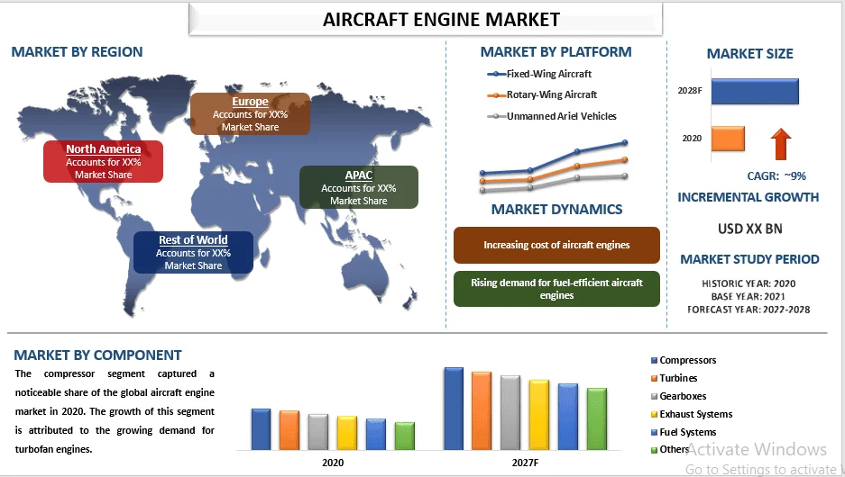 According to a new report published by UnivDatos the Aircraft Engine Market is expected to grow at a CAGR of around 9% from 2022-2028. The analysis has been segmented into Type (Turboprop, Turbofan, Turboshaft, and Piston Engine); Component (Compressors, Turbines, Gearboxes, Exhaust Systems, Fuel Systems, and Others); Platform (Fixed-Wing Aircraft, Rotary-Wing Aircraft, and Unmanned Ariel Vehicles); Technology (Conventional and Hybrid); Region/Country.