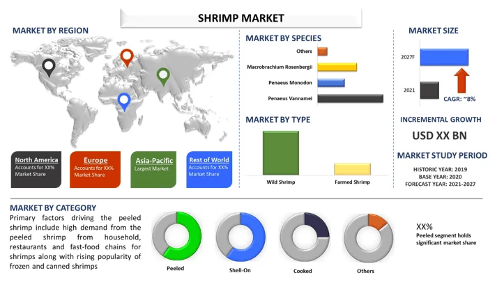 A comprehensive overview of the Shrimp Market is recently added by UnivDatos to its humongous database. The report has been aggregated by collecting informative data from various dynamics such as market drivers, restraints, and opportunities. This innovative report makes use of several analyses to get a closer outlook on the Shrimp Market in the Global context. This report offers a detailed analysis of the latest industry developments and trending factors that are influencing market growth. Furthermore, this statistical market research repository examines and estimates the Shrimp Market at the regional & country levels. Shrimp Market is expected to grow at a CAGR of ~8% between 2021-2027.
