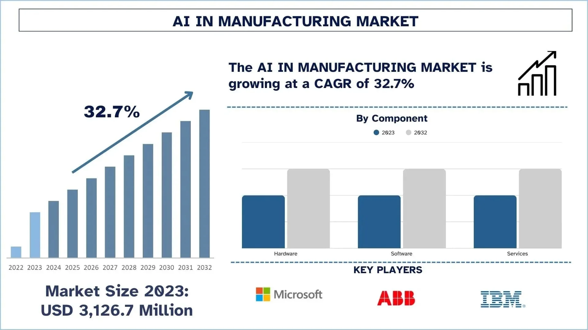 As per their “AI in Manufacturing Market” report, the Indian market was valued at USD 3,126.7 million in 2023, growing at a CAGR of about 32.7% during the forecast period from 2024 - 2032 to reach USD million by 2032.