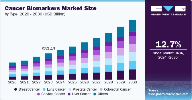 The global cancer biomarkers market was valued at USD 30.35 billion in 2023 and is projected to reach USD 69.76 billion by 2030, demonstrating a robust Compound Annual Growth Rate (CAGR) of 12.7% from 2024 to 2030. These biomarkers are critical in determining cancer patient prognosis and play a significant role in diagnosing and treating nearly every patient.