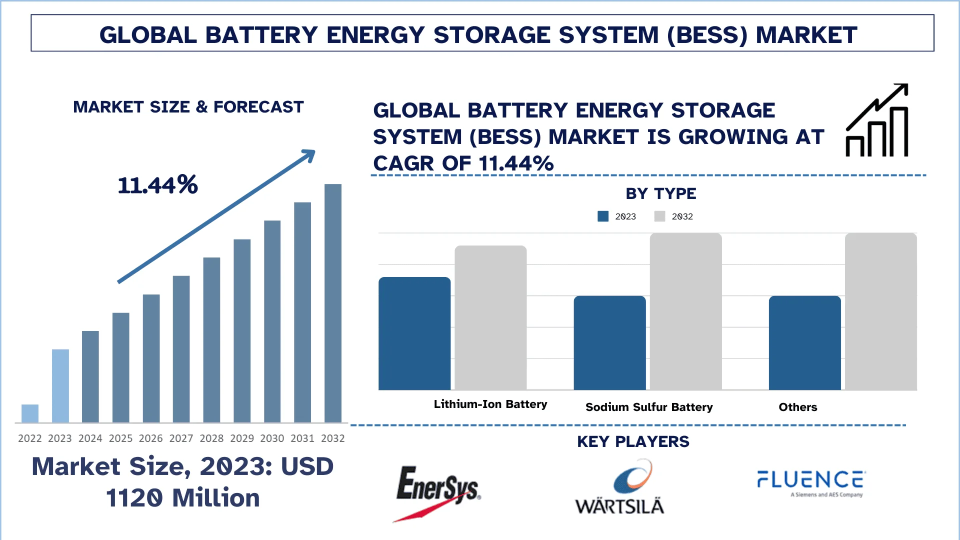 According to the Univdatos, growing demand for power delivering systems and its safety features will drive the growth scenario of Battery Energy Storage System (BESS) and as per their “Battery Energy Storage System (BESS) Market” report, the global market was valued at USD 1120 million in 2023, growing at a CAGR of 11.44% during the forecast period from 2024 - 2032 to reach USD million by 2032.