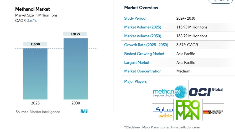 A recently released report by Mordor Intelligence analyzes the “Methanol Market,” highlighting key developments, market growth, and expected trends through 2030. Methanol Market Size is projected at 115.90 Million tons in 2025 and is anticipated to increase to 138.79 Million tons by 2030, registering a compound annual growth rate (CAGR) of 3.67% throughout the forecast duration (2025-2030).