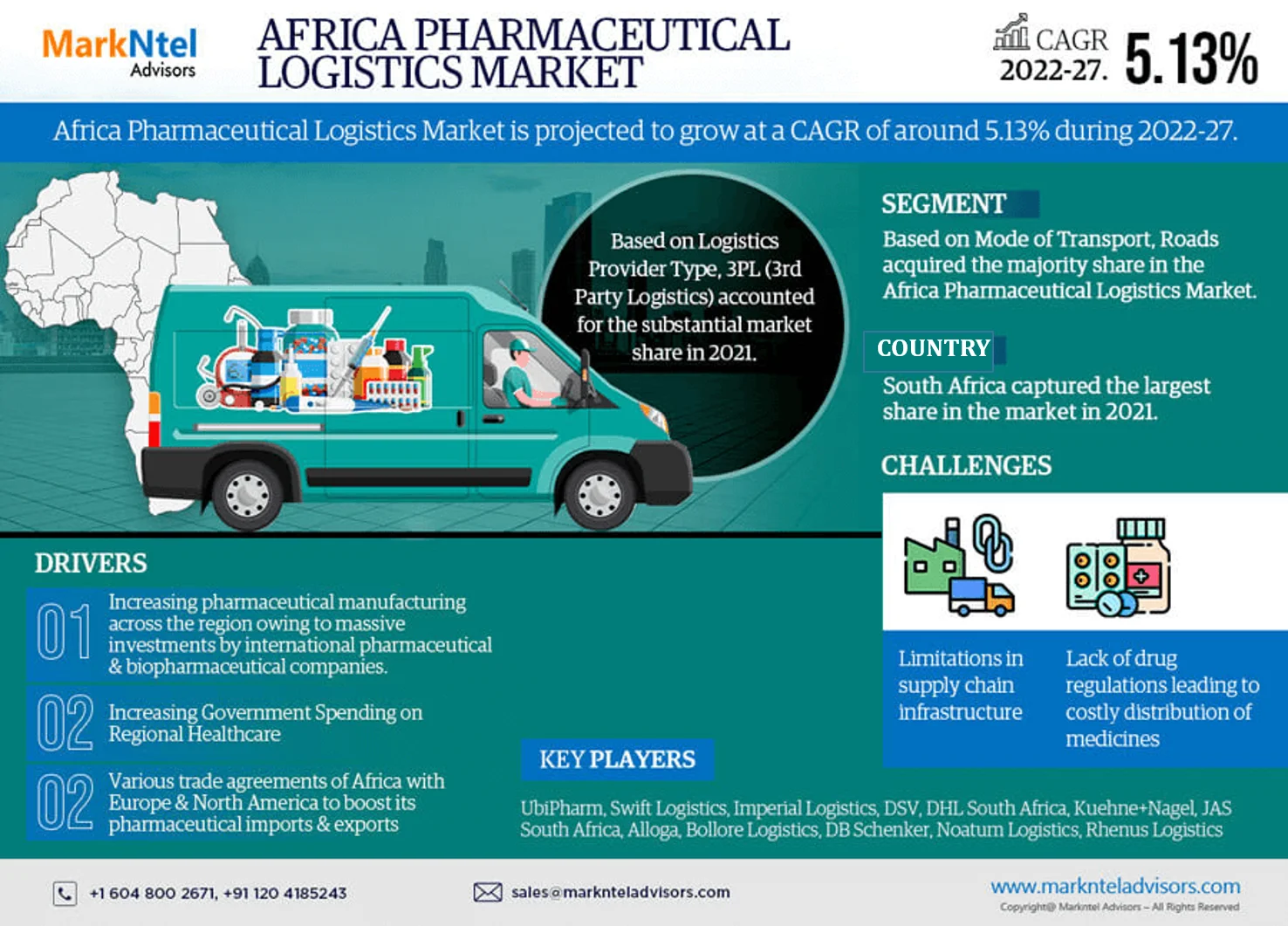The Africa Pharmaceutical Logistics Market size is projected to grow at a CAGR of around 5.13% during the forecast period, 2022-27. According to MarkNtel Advisors Study.