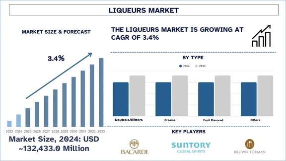 According to the UnivDatos, rising demand for premium and craft liqueurs, increasing consumer interest in flavored alcoholic beverages, and the expanding presence of liqueurs in emerging markets drive the Liqueurs market. As per their “Liqueurs Market” report, the global market was valued at USD 132,433.0 Million in 2024, growing at a CAGR of about 3.4% during the forecast period from 2025 - 2033 to reach USD Million by 2033.
