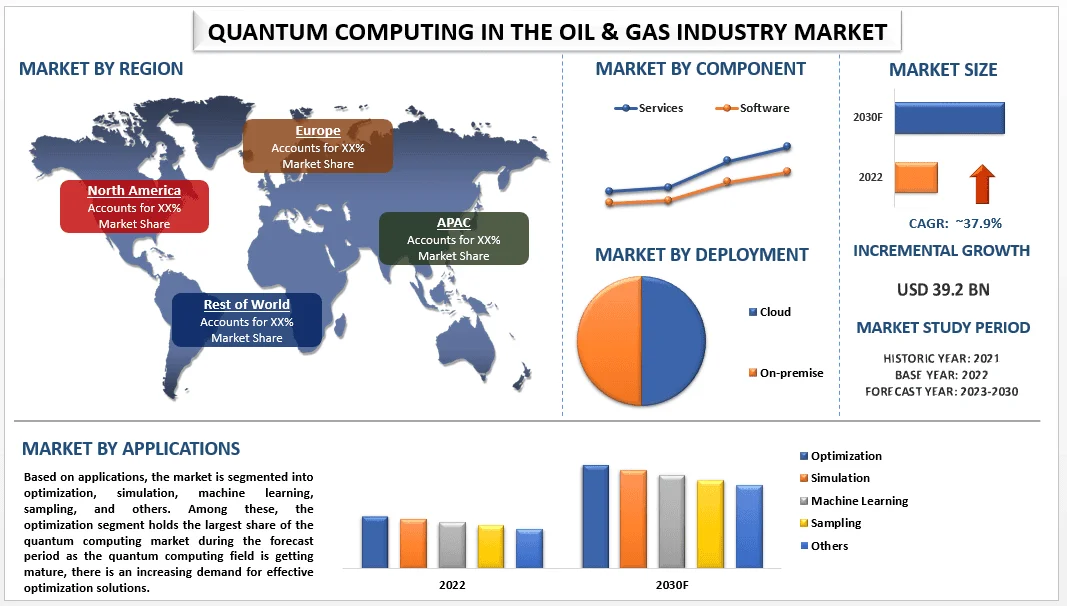 According to a new report published by UnivDatos, the Quantum Computing in the Oil & Gas Industry Market was valued at USD 39.2 billion in 2023 & is expected to grow at a CAGR of 37.9% from 2023-2030. The analysis has been segmented into Component (services and software); Deployment (cloud, and on premise); Applications (optimization, simulation, machine learning, sampling, and others); Region/Country.