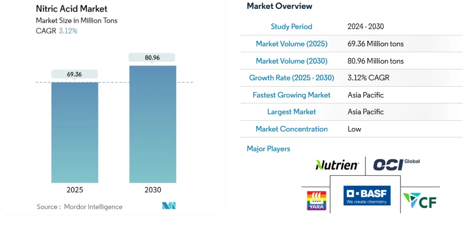 The global Nitric Acid Market is estimated at 69.36 million tons in 2024, with expectations to reach 80.96 million tons by 2030, growing at a compound annual growth rate (CAGR) of approximately 3.12% during 2024–30. Asia‑Pacific remains the leading region, accounting for about 58% of the global volume and exhibiting the fastest regional growth at around 3.74% CAGR in the outlook period. This press release provides an updated picture per Mordor Intelligence, including major players, key usage areas, and regional insights.