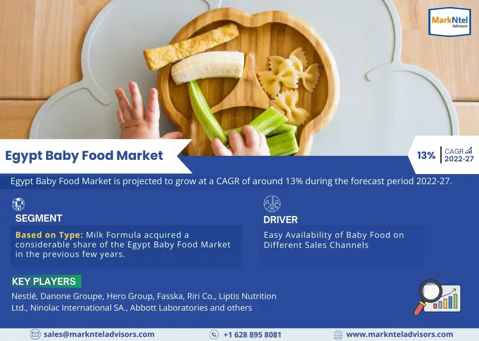 The Egypt Baby Food Market size is projected to grow at a CAGR of around 13% during the forecast period, i.e., 2022-27. According to MarkNtel Advisors Study.
