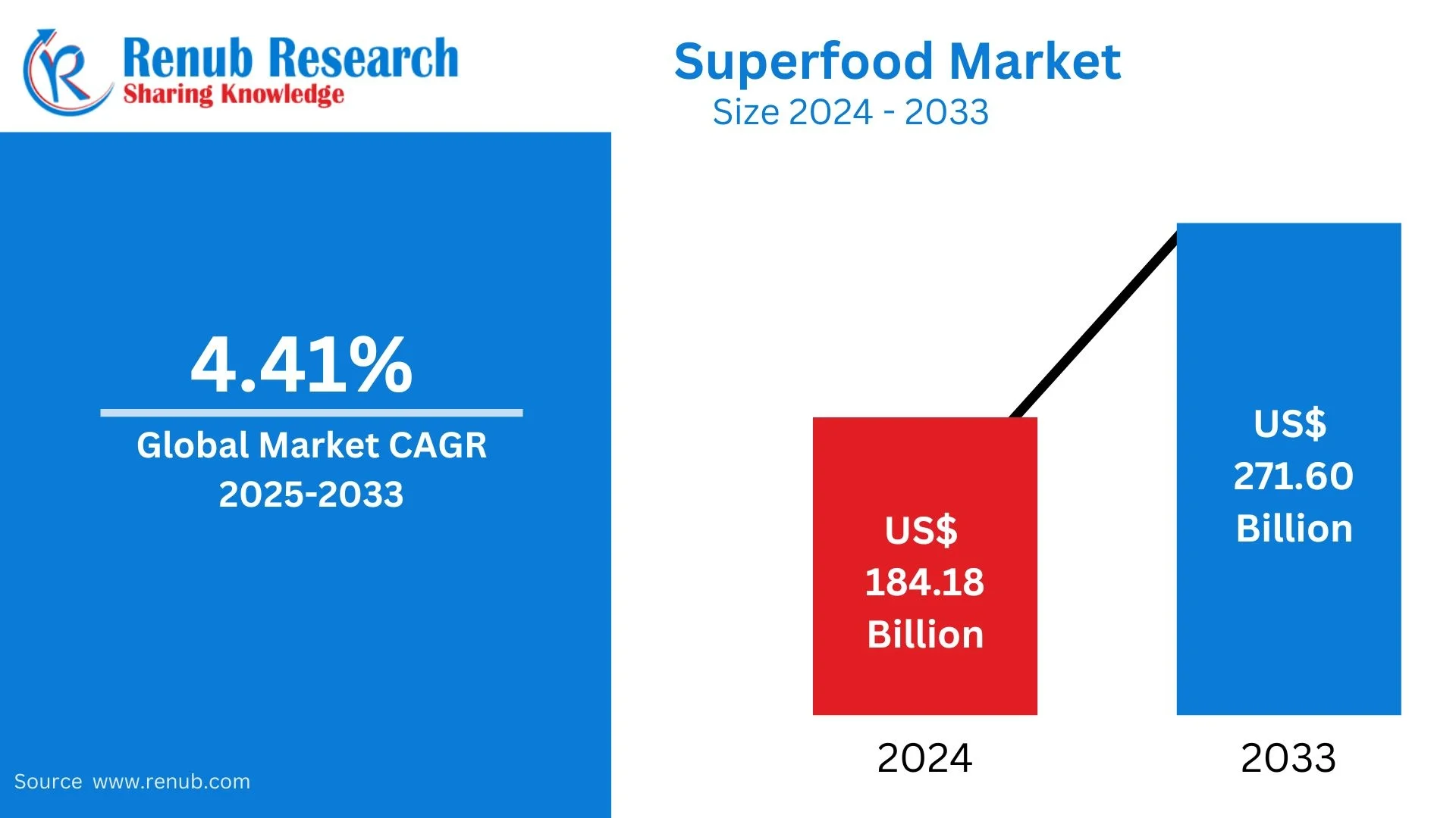 The global superfood market is witnessing substantial growth due to a rising emphasis on health and wellness, which is prompting consumers to adopt nutrient-dense foods. According to the latest data by Renub Research, the market was valued at US$ 184.18 Billion in 2024 and is forecast to reach US$ 271.60 Billion by 2033, growing at a CAGR of 4.41% during the 2025–2033 period.