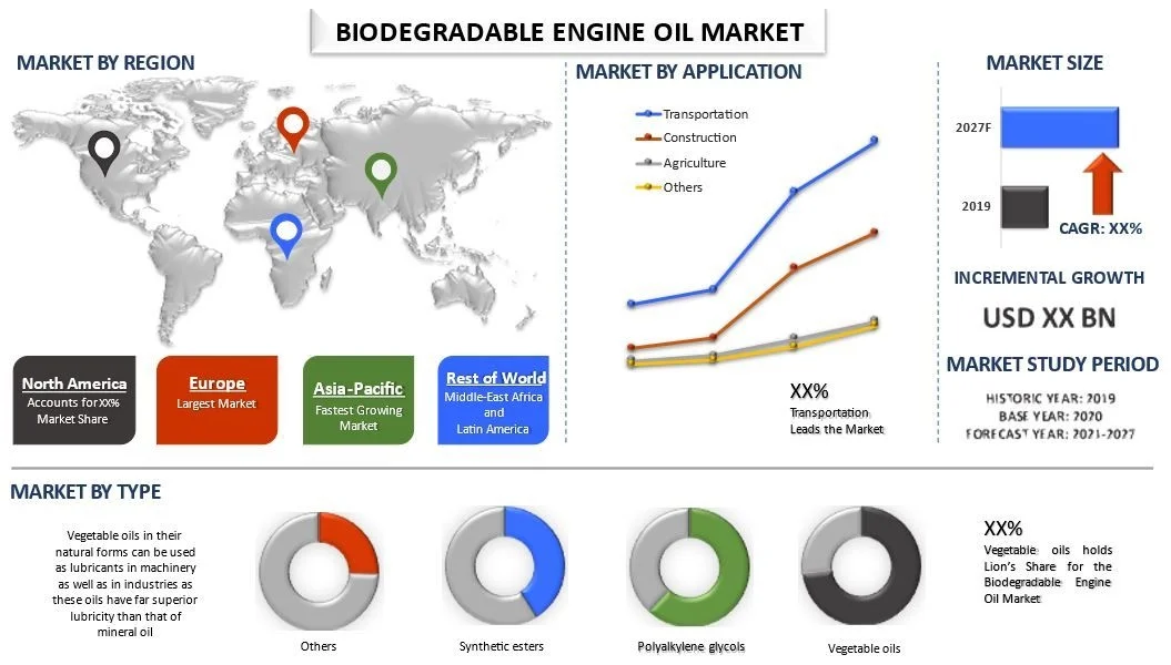 Amongst applications, the transportation segment of the global biodegradable engine oil market was valued at US$ X billion in 2020 and is likely to reach US$ X billion by 2027 growing at a CAGR of X% from 2021-2027.