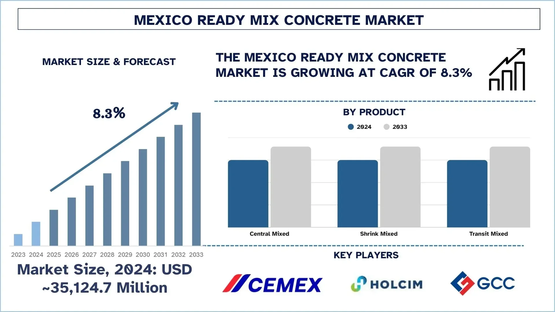 According to the UnivDatos, rising infrastructure development and increasing urbanization would drive the Mexico Ready Mix Concrete market. As per their “Mexico Ready Mix Concrete Market” report, the market was valued at USD 35,124.7 Million in 2024, growing at a CAGR of about 8.3% during the forecast period from 2025 - 2033 to reach USD Million by 2033.