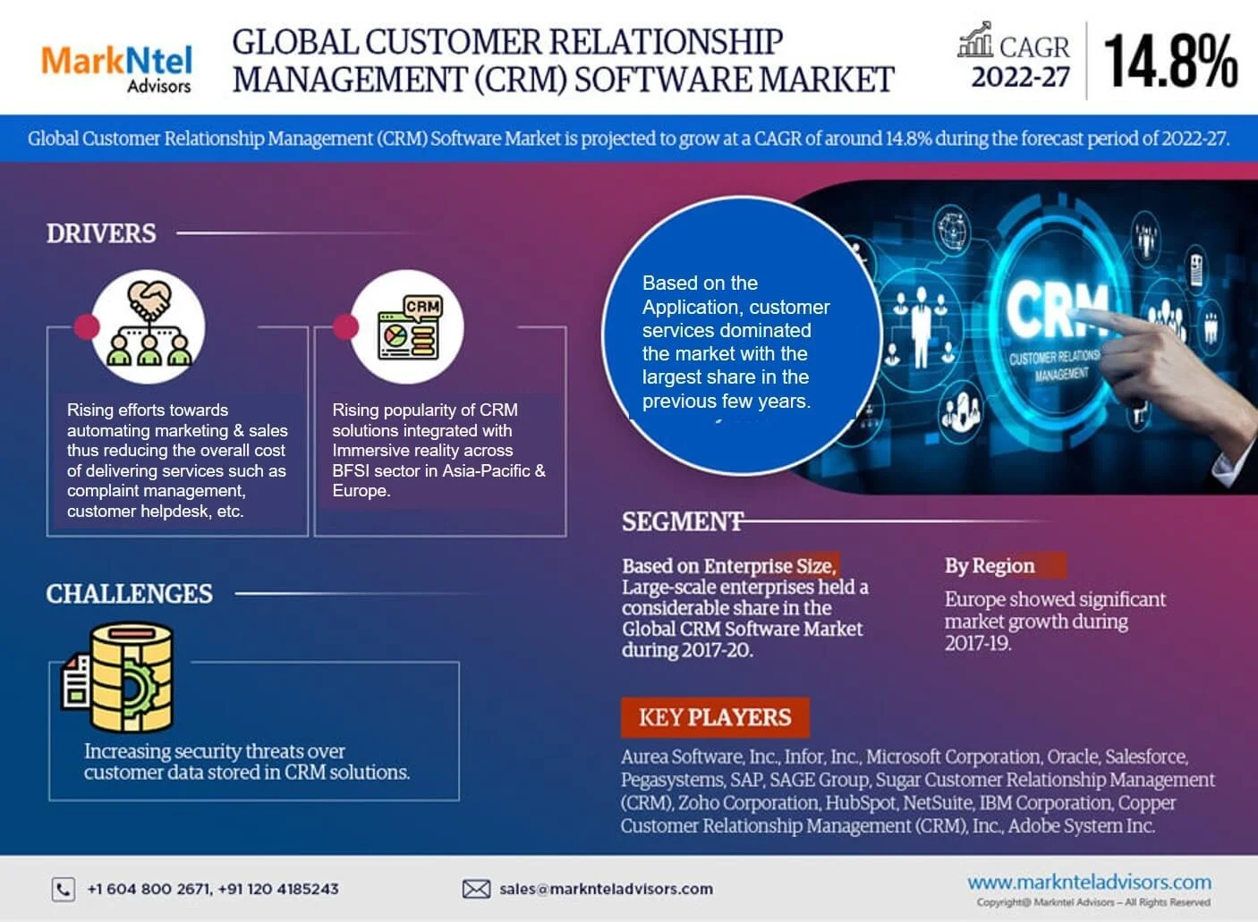 With strategic initiatives, such as mergers, collaborations, and acquisitions, the leading market companies, including - Aurea Software, Inc,. Infor, Inc, Microsoft Corporation, Oracle, Salesforce, Pegasystems, SAP, SAGE Group Sugar Customer Relationship Management (CRM), Zoho Corporation, HubSpot, NetSuite, IBM Corporation, Copper Customer Relationship Management (CRM), Inc. ,Adobe System Inc. are looking forward to strengthening their market positions.