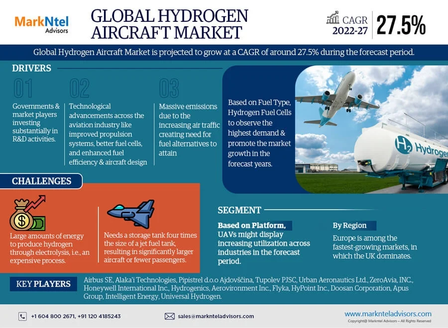 The Global Hydrogen Aircraft Market size is projected to grow at a CAGR of around 27.5% during the forecast period, 2022-27. According to MarkNtel Advisors Study.