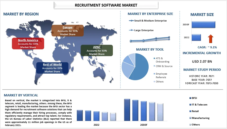 According to the UnivDatos, “Recruitment Software Market” report, the market was valued at USD 2.07 Billion in 2022 and is expected to grow at a CAGR of 9.1% during the forecast period from 2023 - 2030 to reach USD Million by 2030.