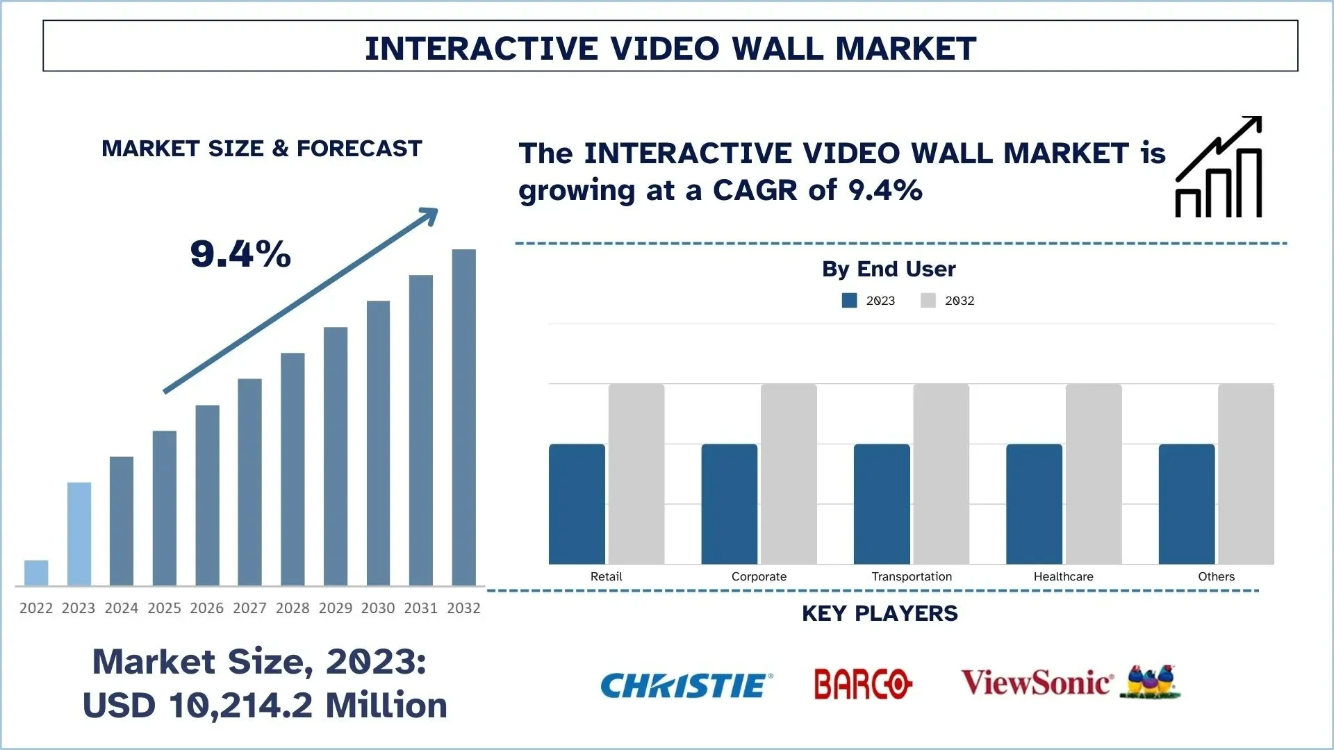 According to the Univdatos, the increasing demand for dynamic, engaging visual experiences across industries like corporate, retail, and education to enhance audience interaction is driving the Interactive Video Wall market's growth in the global scenario of the Interactive Video Wall market. As per their “Interactive Video Wall Market” report, the global market was valued at USD 10,214.2 Million in 2023, growing at a CAGR of 9.4% during the forecast period from 2024 - 2032 to reach USD Million by 2032.