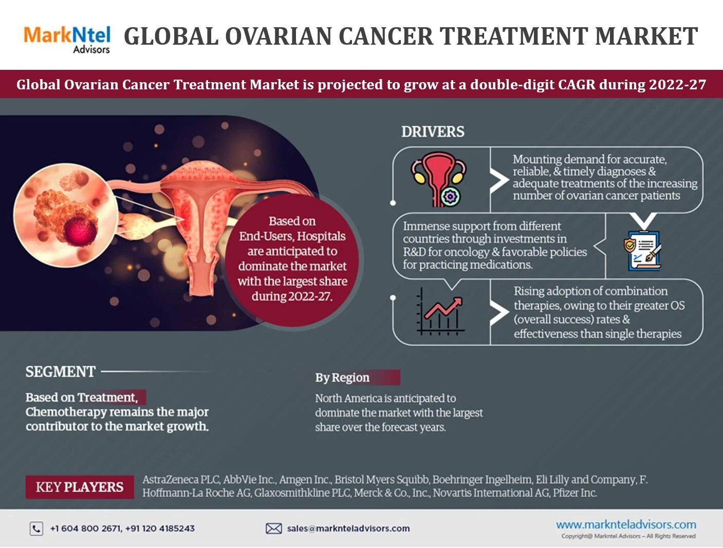 The Global Ovarian Cancer Treatment Market size is projected to grow at a double-digit CAGR during the forecast period, i.e., 2022-27. According to MarkNtel Advisors Study.