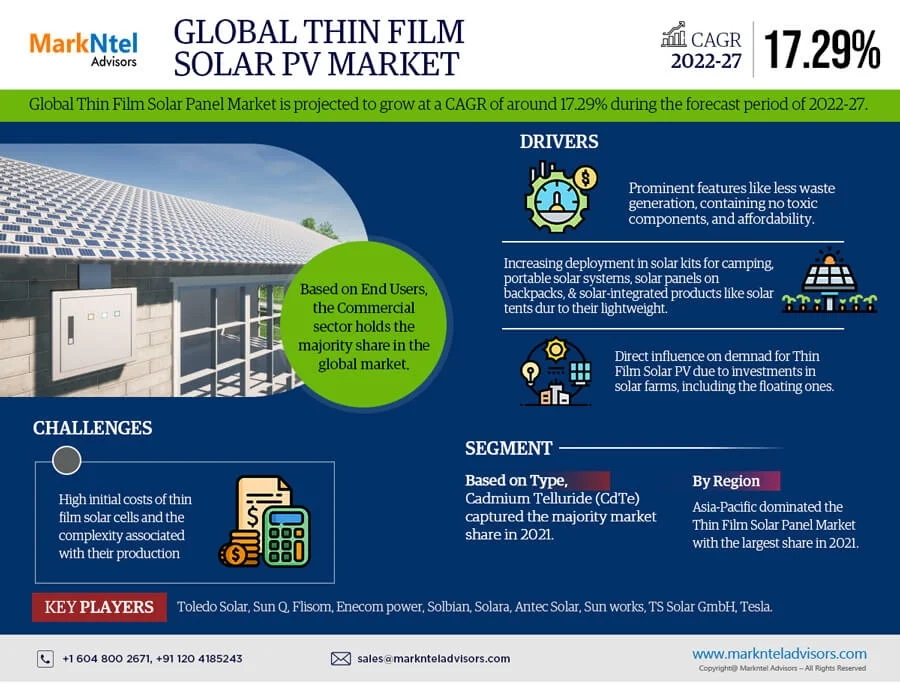 The Global Thin Film Solar Panel Market size is projected to grow at a CAGR of around 17.29% during the forecast period, i.e., 2022-27. According to MarkNtel Advisors Study.