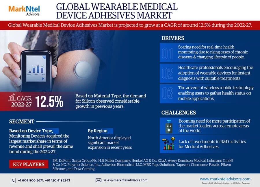 The Global Wearable Medical Device Adhesives Market size is projected to grow at a CAGR of around 12.5% during 2022-27. According to MarkNtel Advisors Study.
