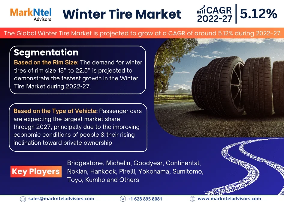 The Global Winter Tire Market size is projected to grow at a CAGR of around 5.12% during the forecast period, i.e., 2022-27. According to MarkNtel Advisors Study.