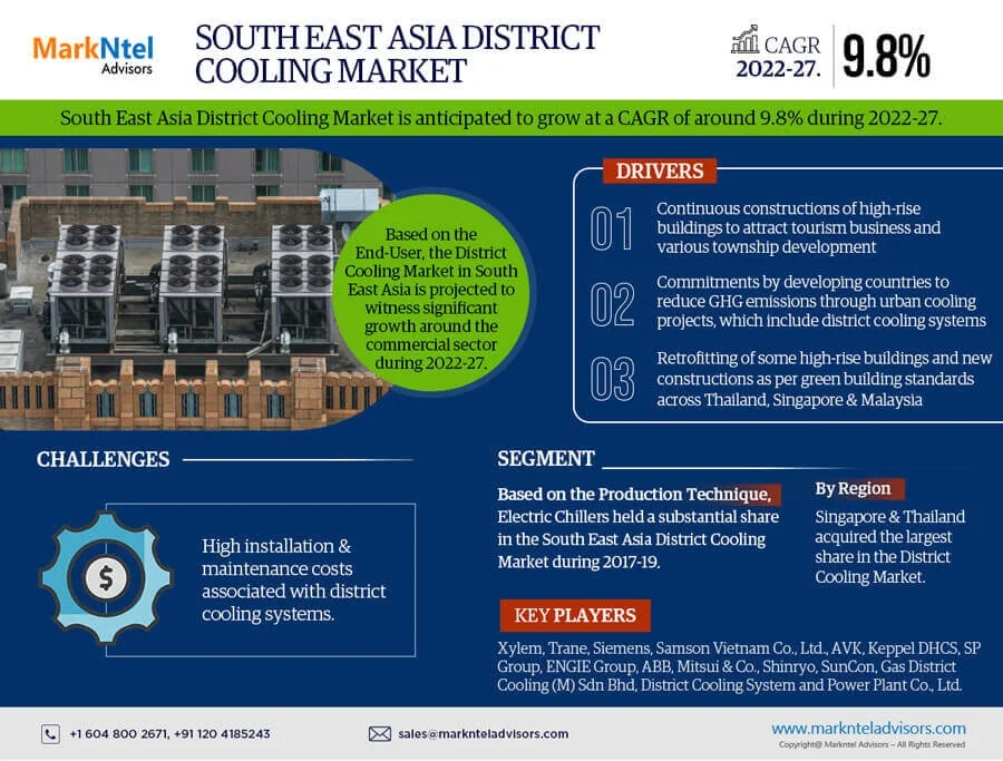 The South East Asia District Cooling Market size is expected to grow at a CAGR of around 9.8% during the forecast period i.e. 2022-2027. According to MarkNtel Advisors Study.