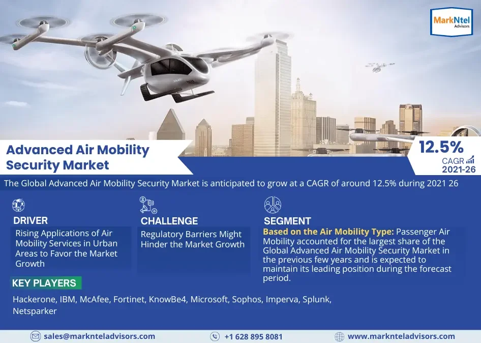 The Global Advanced Air Mobility Security Market size is anticipated to grow at a CAGR of around 12.5% during the forecast period, i.e., 2021 26. According to MarkNtel Advisors Study.