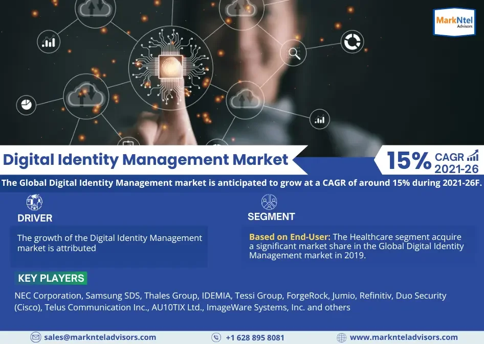 The Global Digital Identity Management Market size is anticipated to grow at a CAGR of around 15% during 2021-26F According to MarkNtel Advisors Study.