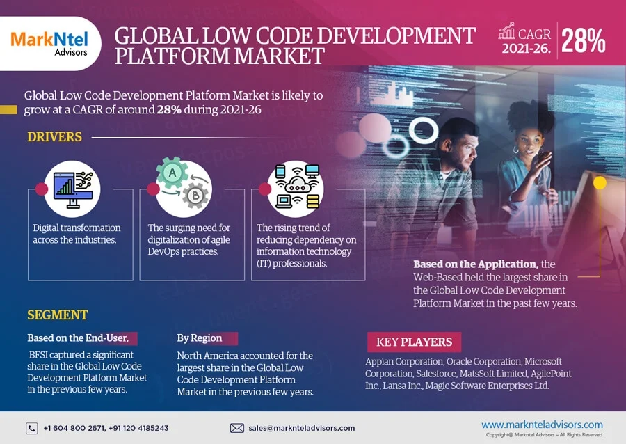 The Global Low Code Development Platform Market size is projected to grow at a CAGR of around 28% during the forecast period, i.e., 2021-26. According to MarkNtel Advisors Study.