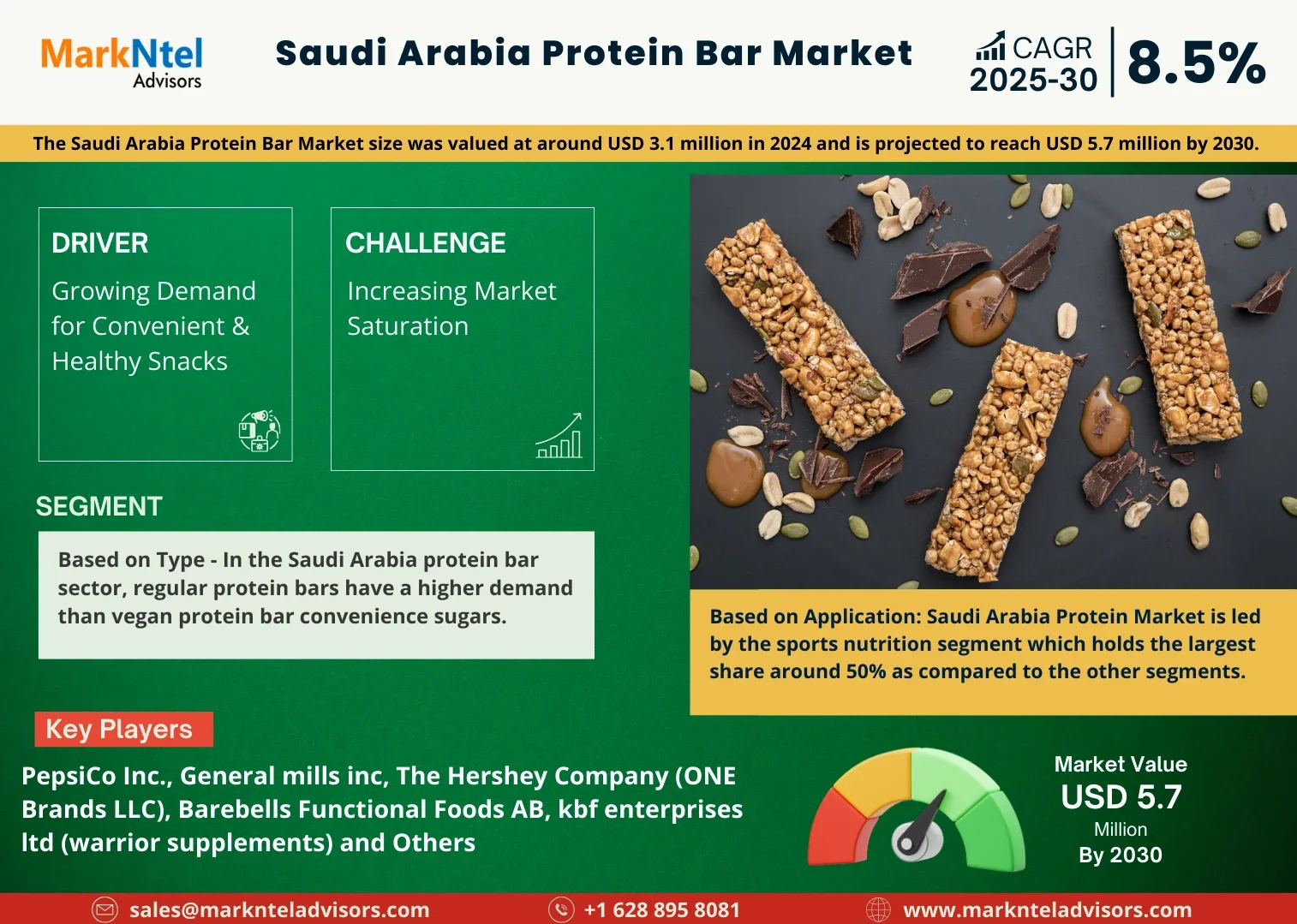 The Saudi Arabia Protein Bar Market size was valued at around USD 3.1 million in 2024 and is projected to reach USD 5.7 million by 2030. Along with this, the market is estimated to grow at a CAGR of around 8.5% during the forecast period, i.e., 2025-30. According to MarkNtel Advisors Study.