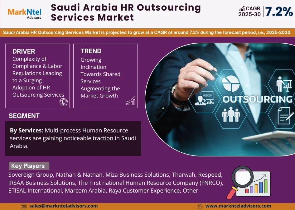 The Saudi Arabia HR Outsourcing Services Market size is projected to grow at a CAGR of around 7.2% during the forecast period, i.e., 2025-2030. According to MarkNtel Advisors Study.