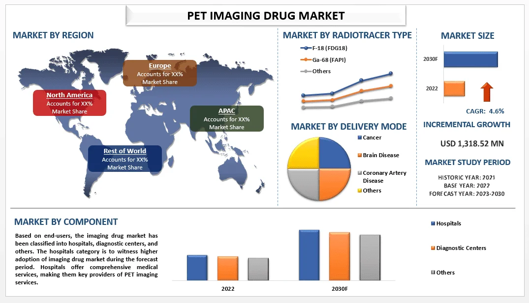 According to the UnivDatos, the surge in the incidences of chronic diseases which will surge in the demand for PET imaging drugs will drive the global scenario of the “PET Imaging Drug Market” report, the global market was valued at USD 1318.52 million in 2022, growing at a CAGR of 4.6% during the forecast period from 2023 - 2030 to reach USD billion by 2030.