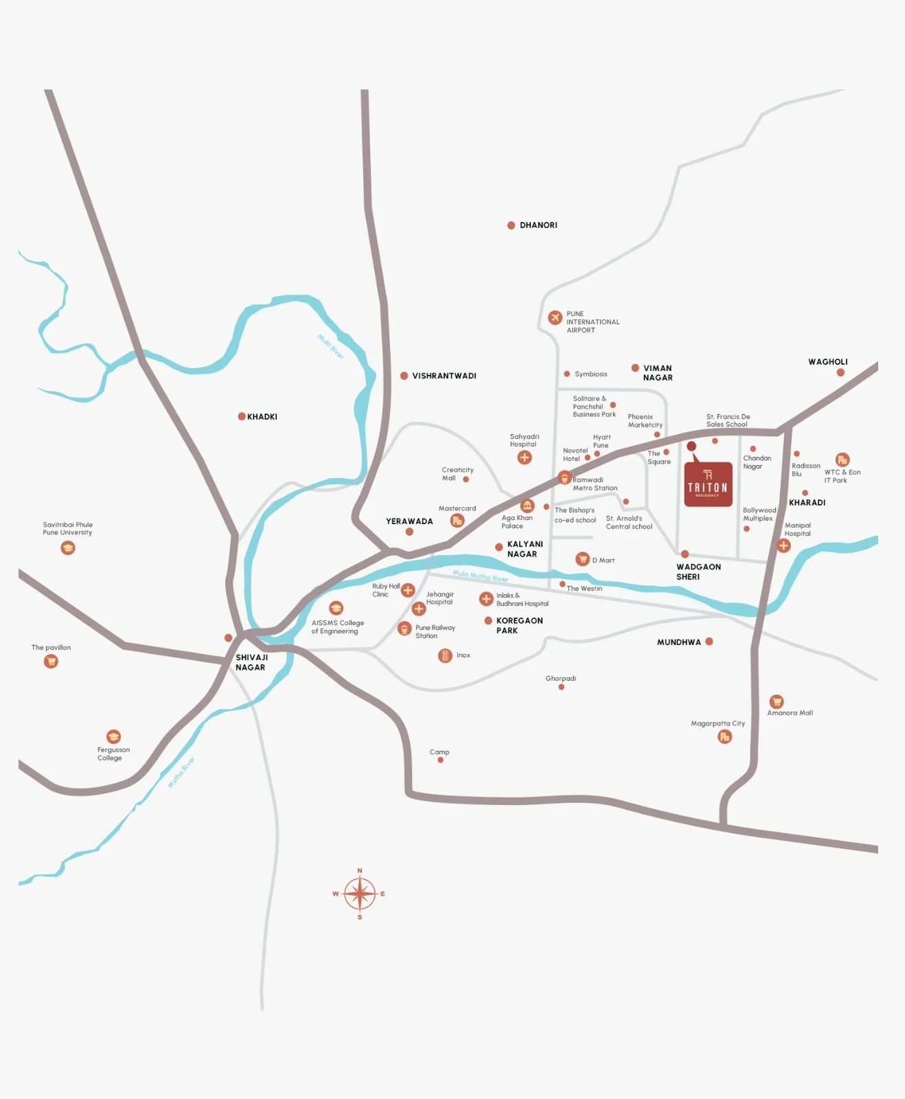From Koregaon Park to Kalyani Nagar and Magarpatta to Hadapsar, Triton Residency sits at the center of it all. The smooth connectivity through Nagar Road and the upcoming metro project ensures residents are always well-connected to prime commercial, entertainment, and educational hubs.