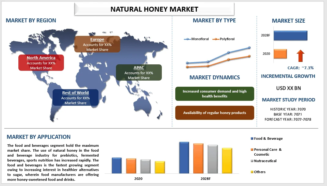According to a new report published by UnivDatos, the Natural Honey Market is expected to grow at a CAGR of around ~7.3% from 2022-2028F. The analysis has been segmented into Type (Monofloral Honey, Polyfloral Honey); Application (Food & Beverage, Personal care & Cosmetic, Nutraceutical, and Others); Region/Country.